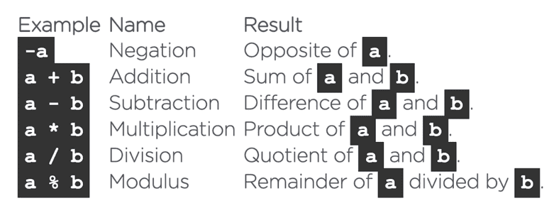 Numbers can be either integers or floating point values (with a decimal). We can use various arithmetic operators to manipulate these values: