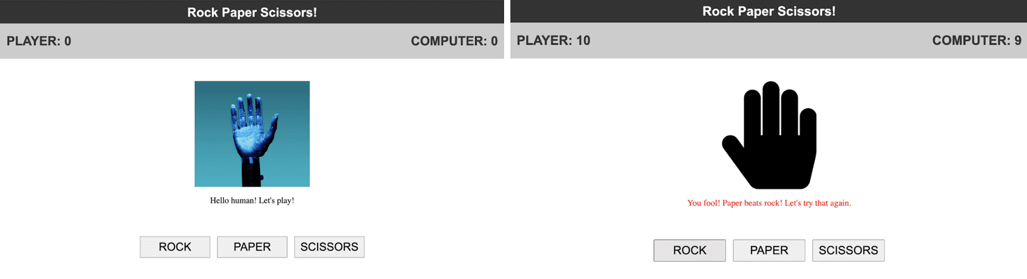Hint: to get this to work, you might want to return an object instead of a text string from the randomMove() function. This could have properties for both the src and the alt text which you’ll need to update from the computer’s picture.