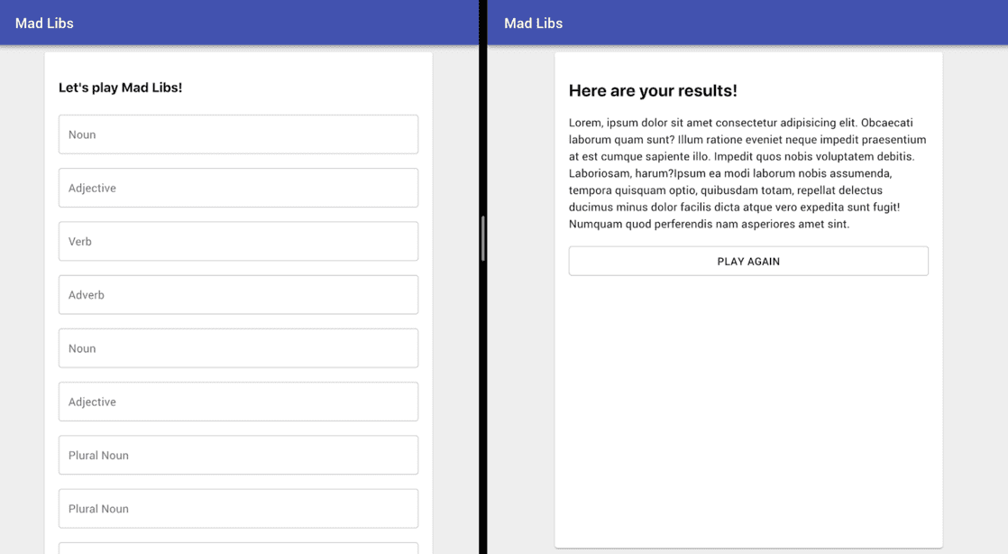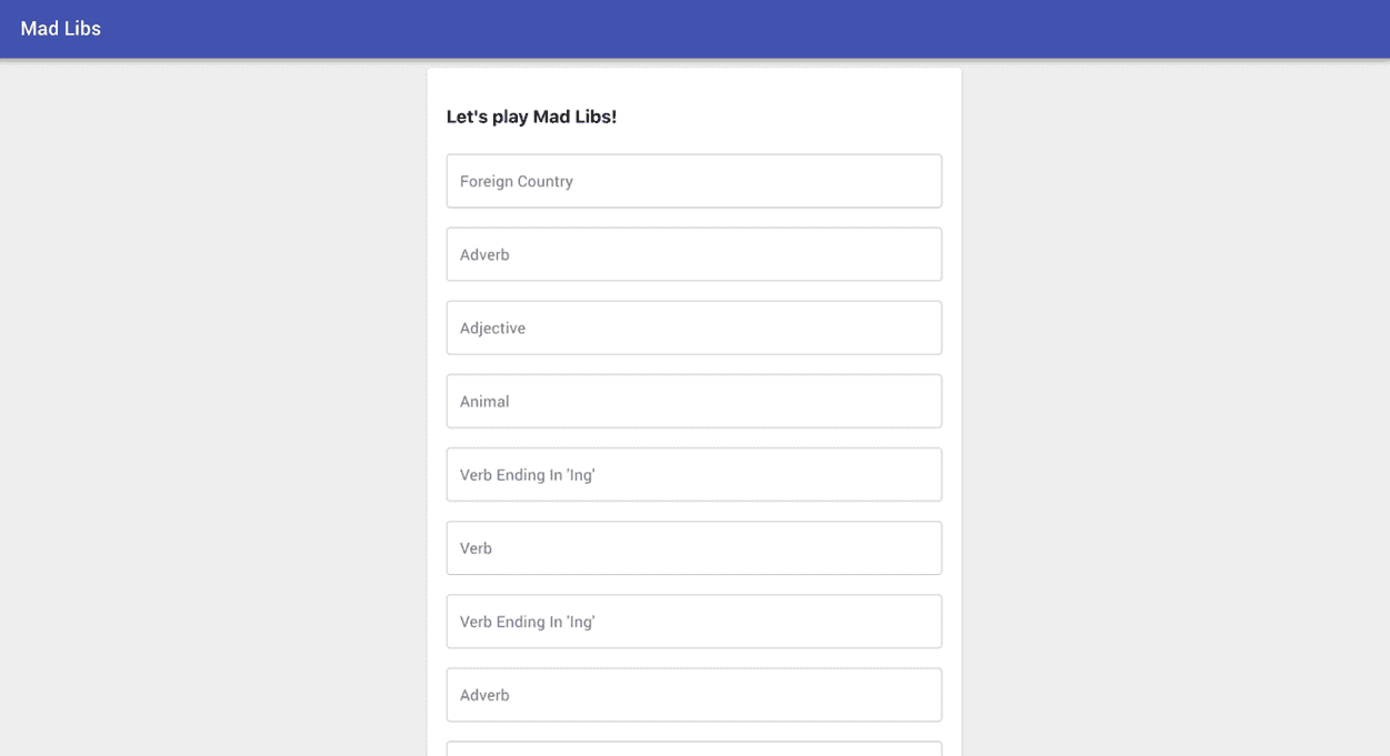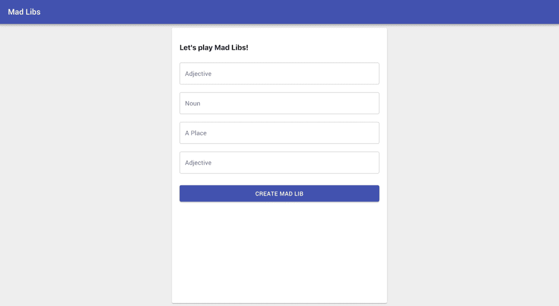 Array.reducemethod useful for this!). - When the user clicks the “Create Mad Lib” button at the bottom of the Form component, this should set the value of the text in the TextContext (global state).