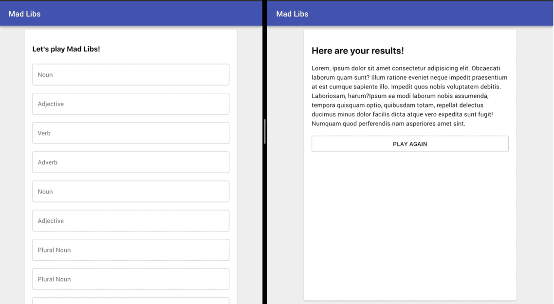 For the bonus homework this week, we’ll be creating an application that lets a user play the game Mad Libs. The concept is that we’ll ask the user to provide a set of words with a form, and then we’ll create a funny story with those words later! This will give us a great chance to get started with using a lot of the new functionality that we learned this week with a real project. You can play with my final version of this week’s project here.